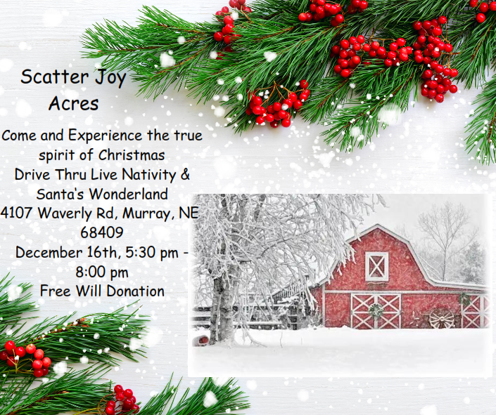 Scatter Joy Acres: Actors Wanted! Live nativity December 16, 5:30-8 PM, warm drinks and treats for those volunteering in 20 minute rounds. Free Will Donation!