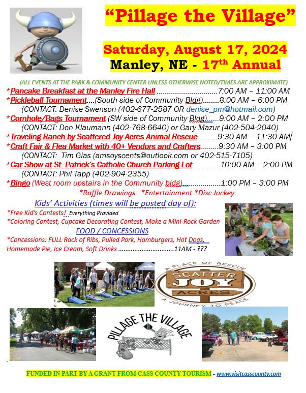Pillage the Village is rapidly approaching. Many activities are planned to keep visitors busy for hours. The day will begin with the traditional pancake feed hosted by the Manley Volunteer Fire department. It is said they have the best pancakes in the county. The morning also hosts the start of both Pickle ball and Corn hole Tournaments, Craft fair, car show and new this year, a petting zoo hosted by Scatter Joy Acres! See below for the full list of activities and times for the day of pillaging. This event is funded in part by Cass County Tourism.