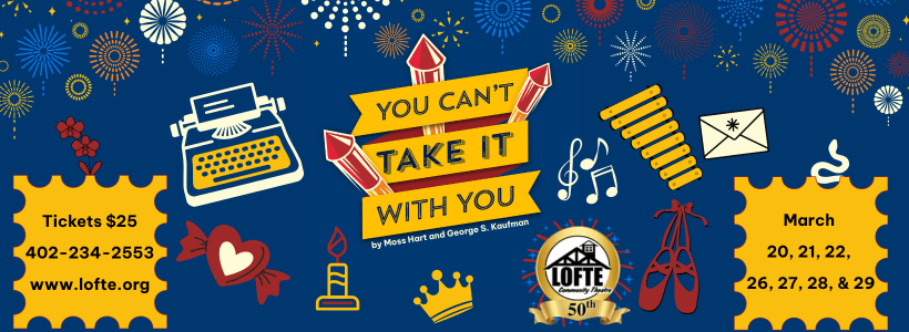 You Can’t Take It With You Performances are March 26, 27, 28, & 29. Shows start at 7:00 on Thursdays, Fridays, and Saturdays, and 2:00 on Sundays. To get tickets for You Can’t Take It With You Click the link below or call 402-234-2553.